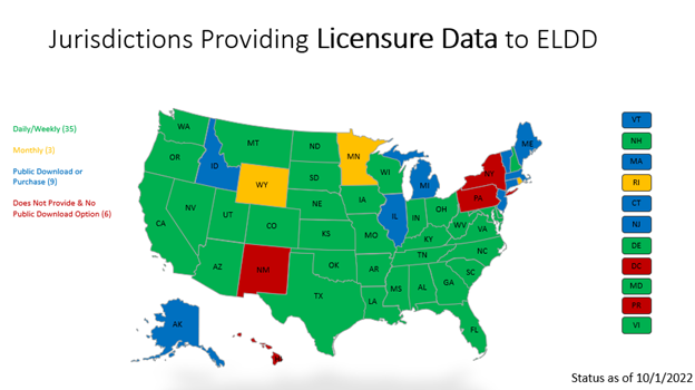 As of October 1, 2022, thirty-five Member Boards currently send licensure data on a daily or weekly basis, and three send it monthly. The FSBPT downloads licensure data from public websites or has to purchase the data in nine jurisdictions. And finally, six jurisdictions do not provide licensure data at all.